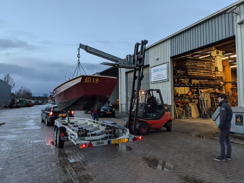 De bouw ging bijna beginnen. We reden de Poseidon naar Bleskensgraaf. We konden gelukkig een mooie trailer lenen van Rene Mast van de van Speijkgroep.