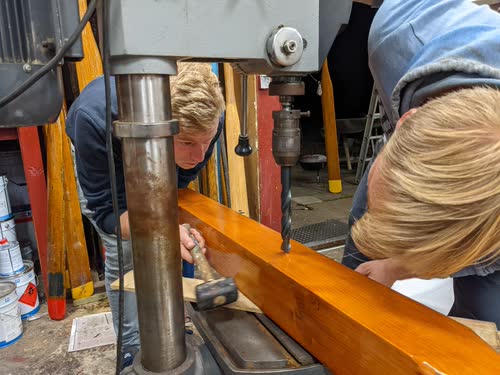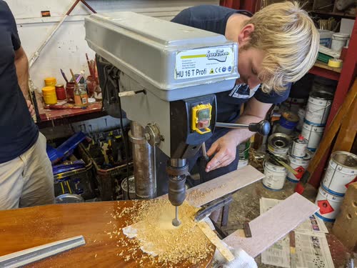 Een spannend moment was het boren van gaten in duur houtwerk. Die enorme boormachine die altijd in de weg staat was ineens heel nuttig. Het gat in de mast kwam net niet waar we wilden maar bleek uiteindelijk best goed te zitten. Mmm.... Daarna zijn geen fouten meer gemaakt.