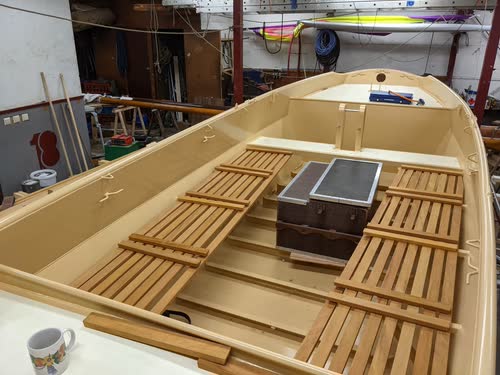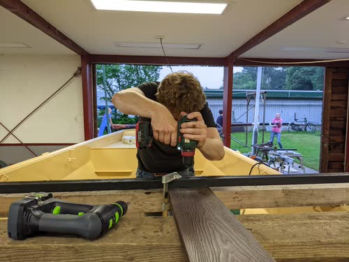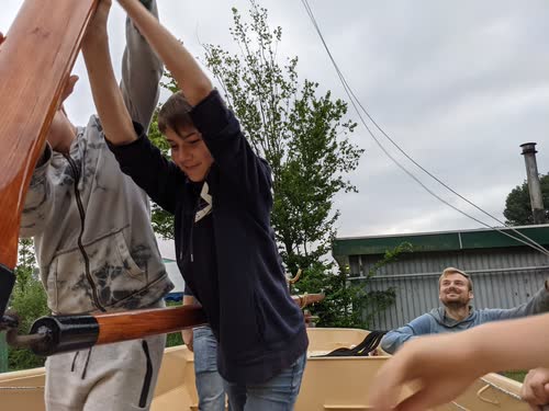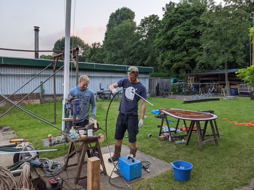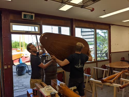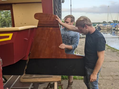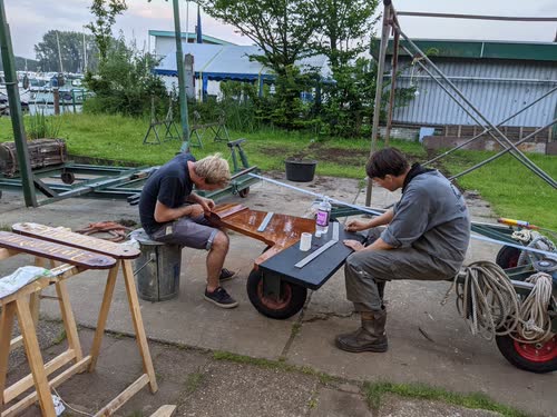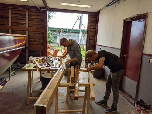 Eind Juni staat in het teken van het namaken van een helmstok, de bankjes, en het lijmen van de mast van Freya... De bankjes zijn breed om lekker op te kunnen slapen.