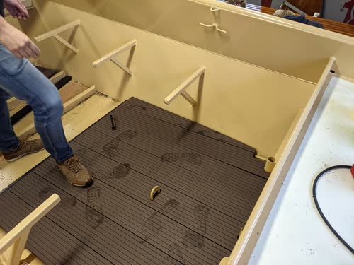 De vlonders krijgen vorm. We hebben gekozen voor woodcomposiet, in de hoop dat dat goed blijft in vochtige omstandigheden ook al overtreden we alle montagevoorschriften van de leverancier. We hebben testsamples de afgelopen maanden ondergedompeld, bevroren en met hamers mishandeld. Alles doorstaan. De layout wordt zo dat één luikje open kan om te hozen in een volgepakte boot.