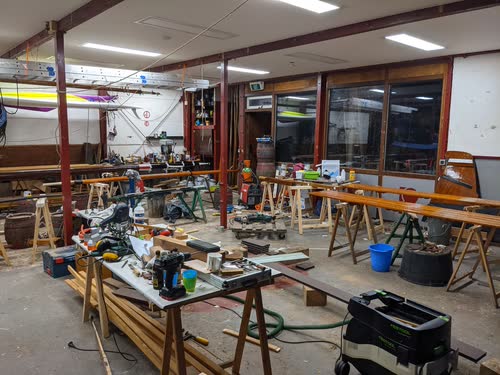 Het houtwerk kwam intussen al binnen. Voorlopig is er geen plek om dit van beslag te voorzien dus alles werd netjes opgeslagen in het matrozenlokaal om er over een paar maanden aan te beginnen.
